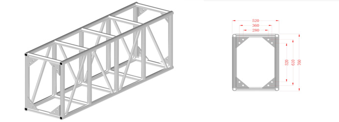 本系列桁架属于大型螺丝连接式桁架,材料采用6082-T6,外形美观,体积较小,承载能力较强,自身重量较轻,安装方便等优点。使用于各种展会 小型演出等不同场合。我们有三种不同连接方式供客户选择:套筒连接方式,螺丝连接方式及M头连接方式。可根据客户要求定做不规则形状。